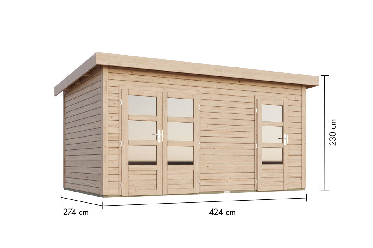 Konstruktion: 28 mm Steck-Schraubsystem. Dach: Flachdach aus 16 mm Massivholz Nut und Feder. (Für eine dauerhafte Lösung empfehlen wir Ihnen gegen Aufpreis unsere selbstklebende Dachbahn, siehe unten). Tür: Doppelflügeltür mit Lichtausschnitten aus Kunstglas (140 x 173 cm), Einflügeltür mit Lichtausschnitt aus Kunstglas (82,5 x 173 cm) Zylinderschlösser mit 2 Schlüsseln. Fussboden: Als Zubehör (gegen Aufpreis) erhältlich, Massivholzboden mit Nut und Feder. Unterkonstruktion: ca. 60 mm breite Bodenbalken, kesseldruckimprägniert.