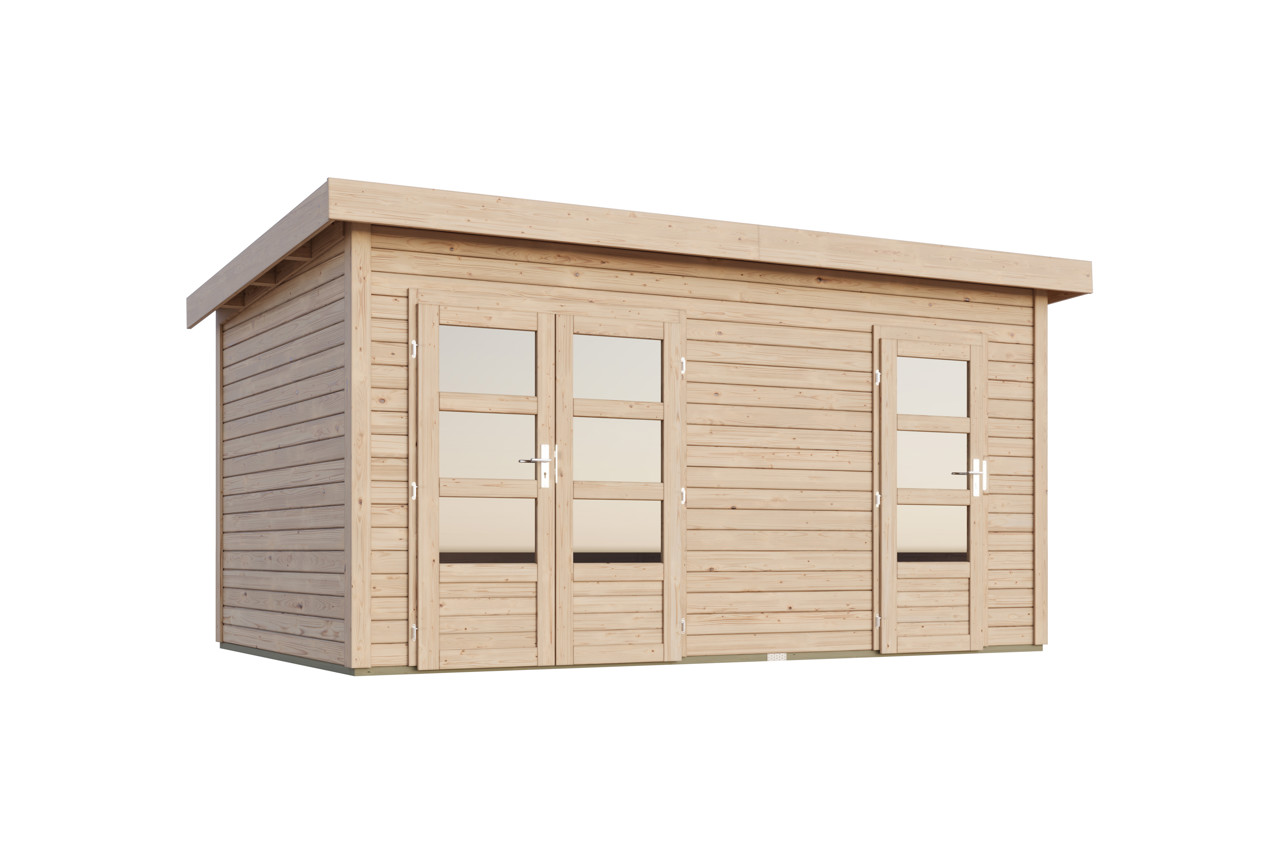 Modernes Flachdach-Blockbohlenhaus im 28 mm Steck-Schraubsystem. Das Gartenhaus überzeugt nicht nur die moderne Optik oder das massive Flachdach inkl. Bitumendachbelag zur Ersteindeckung, vorallem die Trennwand, die das Haus zu einem Zweiraumhaus gestaltet ist ein echtes Highlight. Zwei Räume davon einer mit einer Doppelflügeltür und der andere mit einer Einflügeltür zeichen dieses Gartenhaus aus. Gemütliches Zusammensitzen und gleichzeitges Verstauen der Gartenutensilien ist hiermit kein Problem mehr!