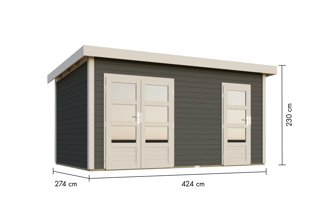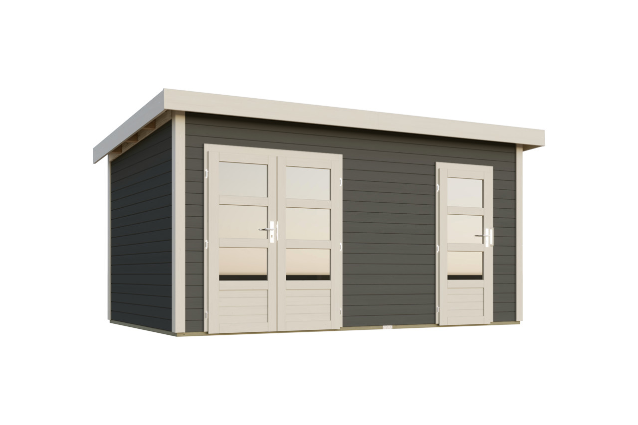 Modernes Flachdach-Blockbohlenhaus im 28 mm Steck-Schraubsystem. Das Gartenhaus überzeugt nicht nur die moderne Optik oder das massive Flachdach inkl. Bitumendachbelag zur Ersteindeckung, vorallem die Trennwand, die das Haus zu einem Zweiraumhaus gestaltet ist ein echtes Highlight. Zwei Räume davon einer mit einer Doppelflügeltür und der andere mit einer Einflügeltür zeichen dieses Gartenhaus aus. Gemütliches Zusammensitzen und gleichzeitges Verstauen der Gartenutensilien ist hiermit kein Problem mehr!