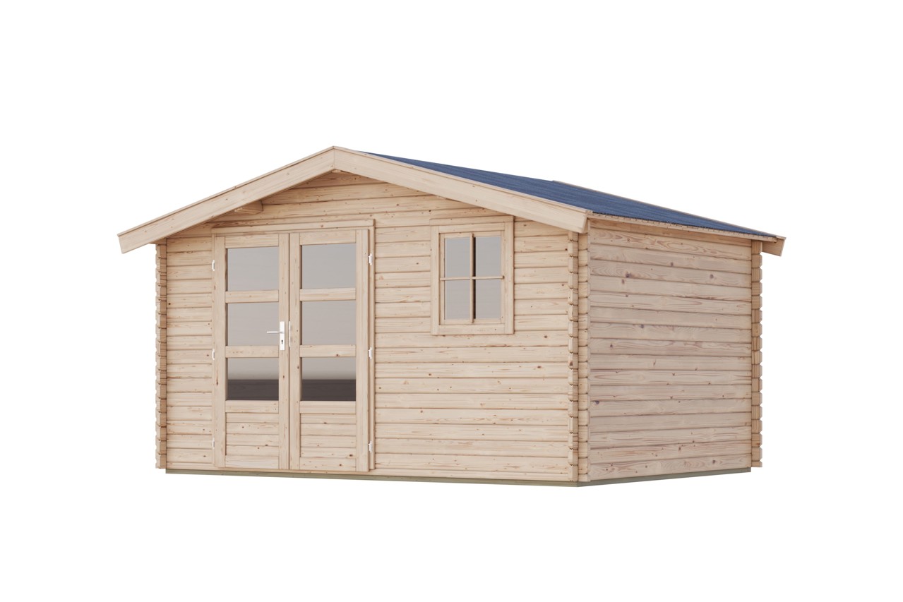 Konstruktion: 38 mm Blockbohlen, 6-Plus Eckverbindung. Dach: Satteldach aus 19 mm Massivholz Nut und Feder. (Für eine dauerhafte Lösung empfehlen wir Ihnen gegen Aufpreis unsere Dachschindeln, siehe unten). Tür: Doppelflügeltür mit 3 Lichtausschnitten aus Kunstglas und aufgesetzten Sprossen (152 x 179 cm), Zylinderschloss mit 2 Schlüsseln. Fussboden: Als Zubehör (gegen Aufpreis) erhältlich, Massivholzboden mit Nut und Feder. Unterkonstruktion: ca. 60 mm breite Bodenbalken, kesseldruckimprägniert