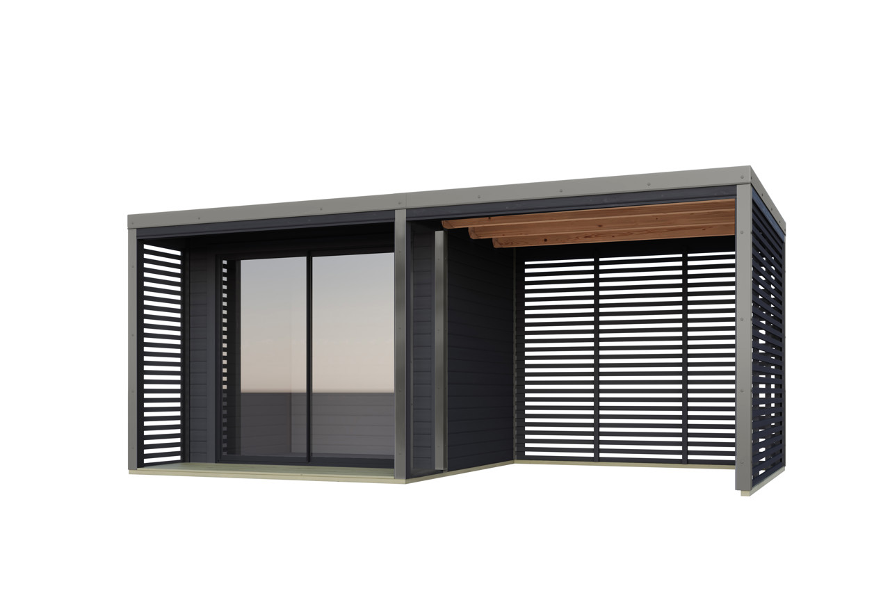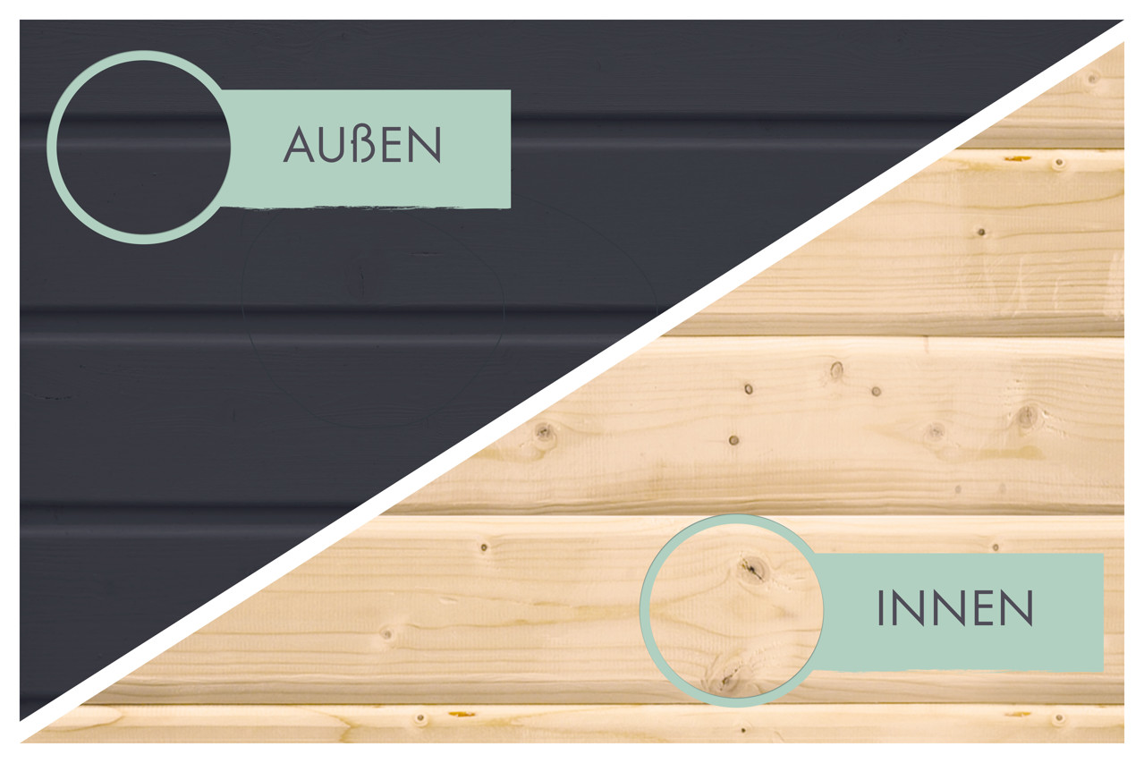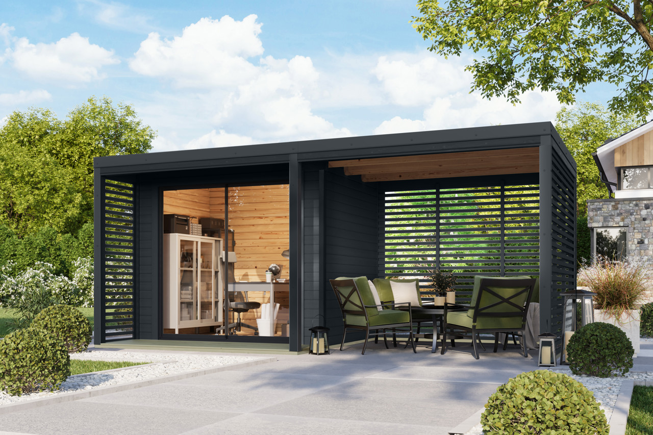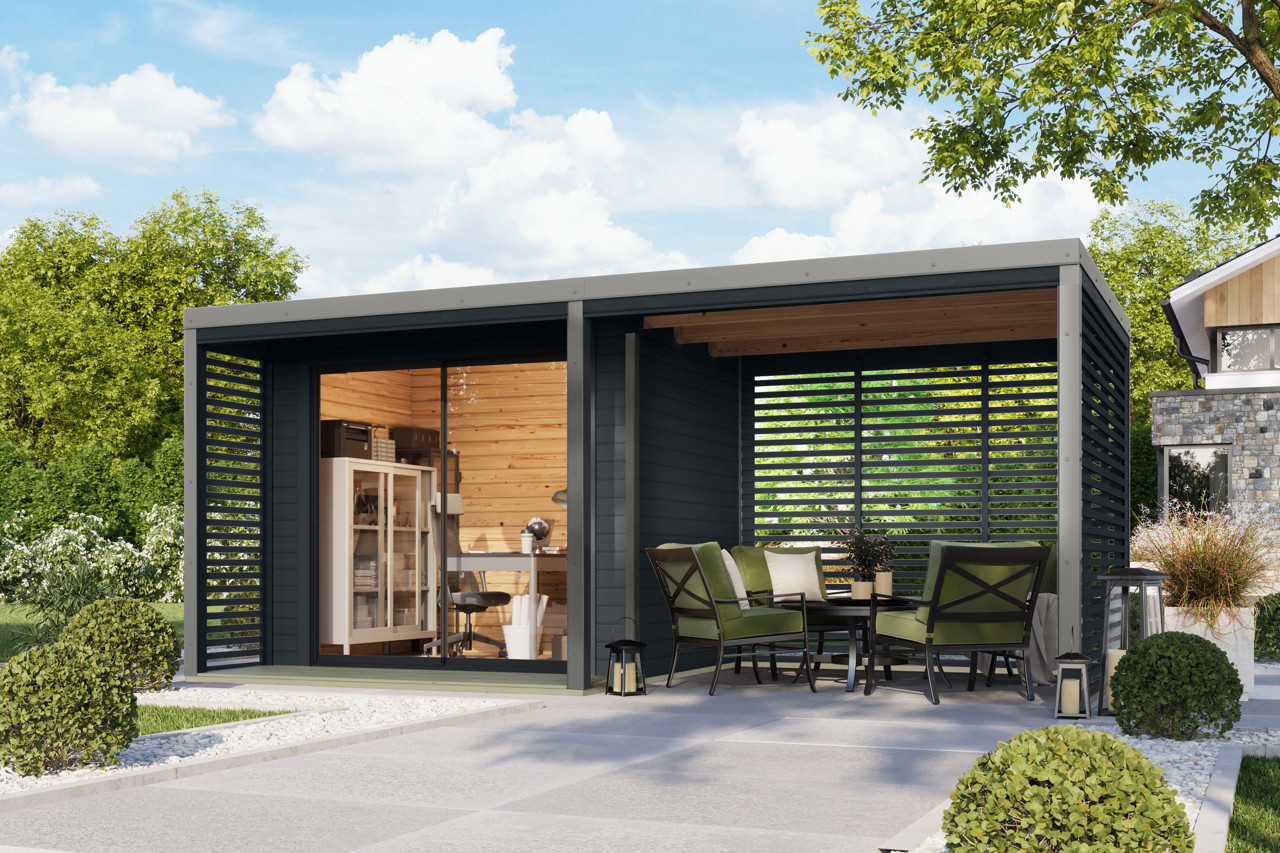 Karibu 38 mm Gartenhaus Saturn anthrazit mit Anbaudach