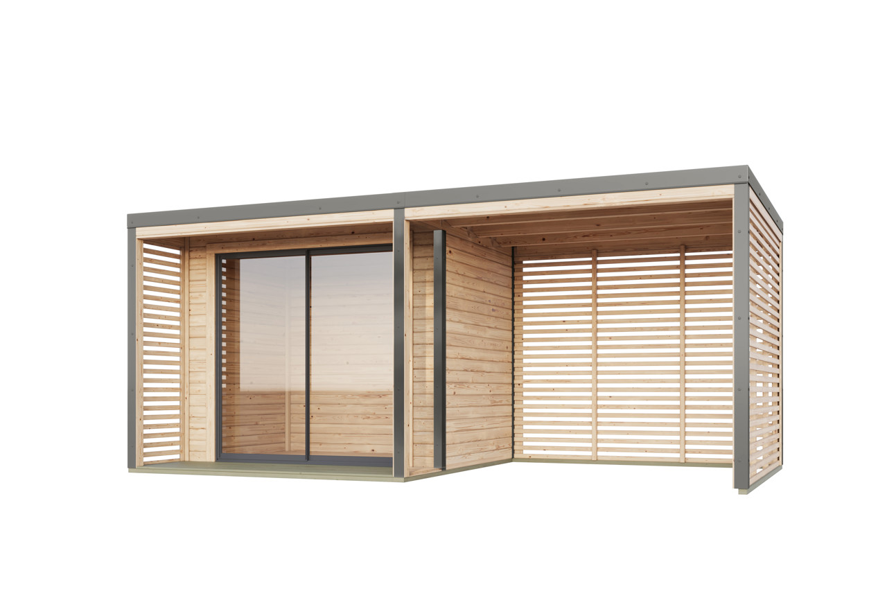 Die kesseldruckimprägniert-beplankte Terrassenfläche und die integrierten Lamellenwände schaffen einen harmonischen, geschützten Außenbereich. Ebenfalls im Lieferumfang enthalten sind kesseldruckimprägnierte Unterleger sowie ein hochwertiger Massivholzboden.