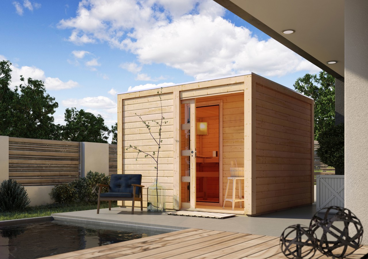 Abb. oben: Saunahaus Cuben in naturbelassen mit Schiebetür aus Klarglas und Zubehör (gegen Aufpreis)