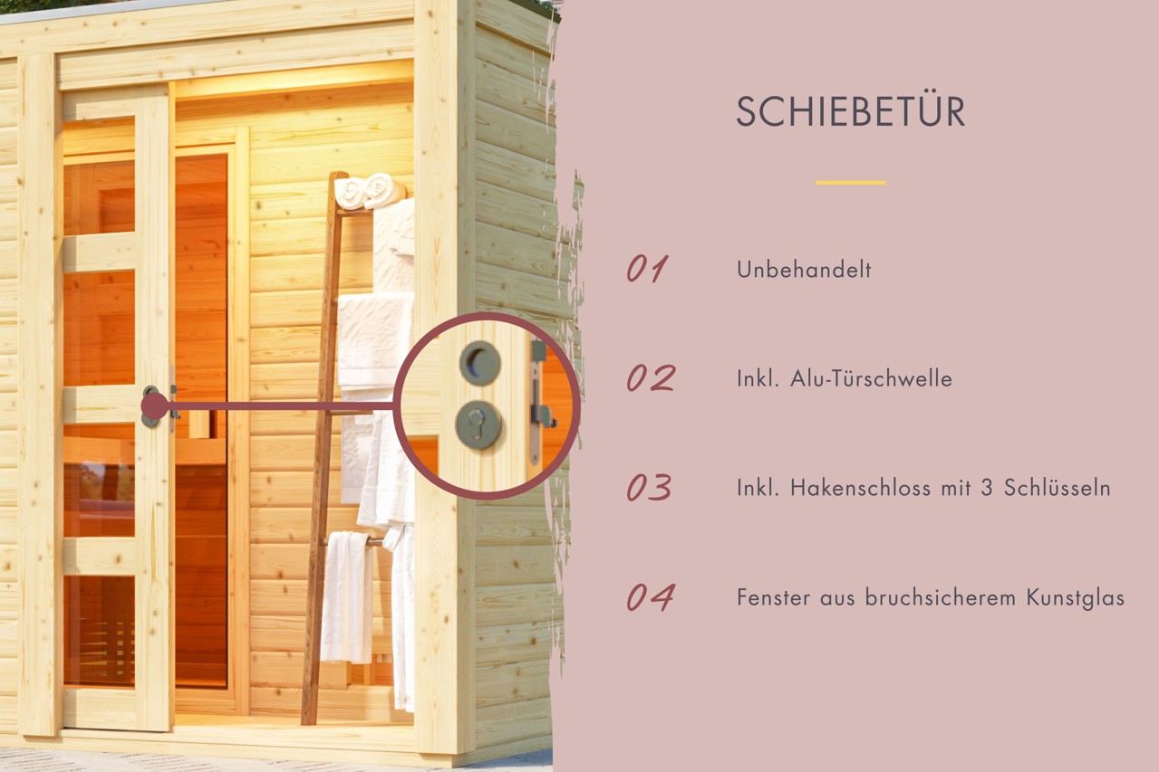 Das massive Hausdach wird mit selbstklebender Dachfolie beklebt (Zubehör gegen Aufpreis), die wärmeisolierte Saunadecke sorgt dafür das die Wärme in der Sauna bleibt. Ein besonderes Highlight ist die 125 cm breite Schiebetür, diese ist mit 4 Lichtausschnitten in Klarglas und einem Drehriegel-Schloss inkl. 2 Schlüsseln ausgestattet.