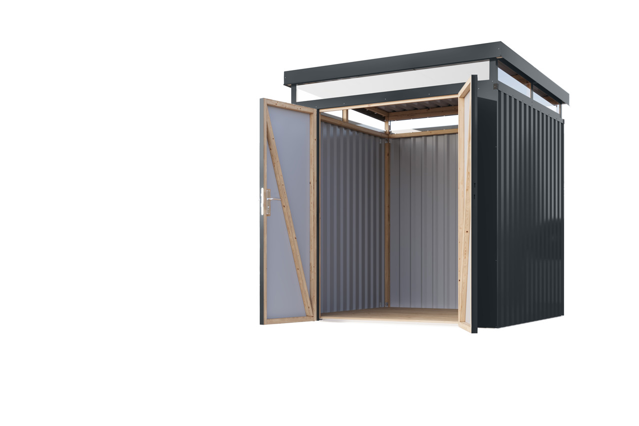 Die Wände bestehen aus hochwertigem, polyesterbeschichtetem Trapezblech. Dieses Material verleiht dem Metallhaus nicht nur eine elegante Optik, sondern bietet auch zuverlässigen Schutz vor Witterungseinflüssen und garantiert eine lange Lebensdauer.