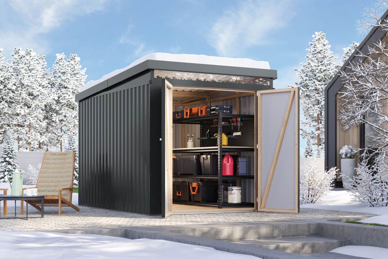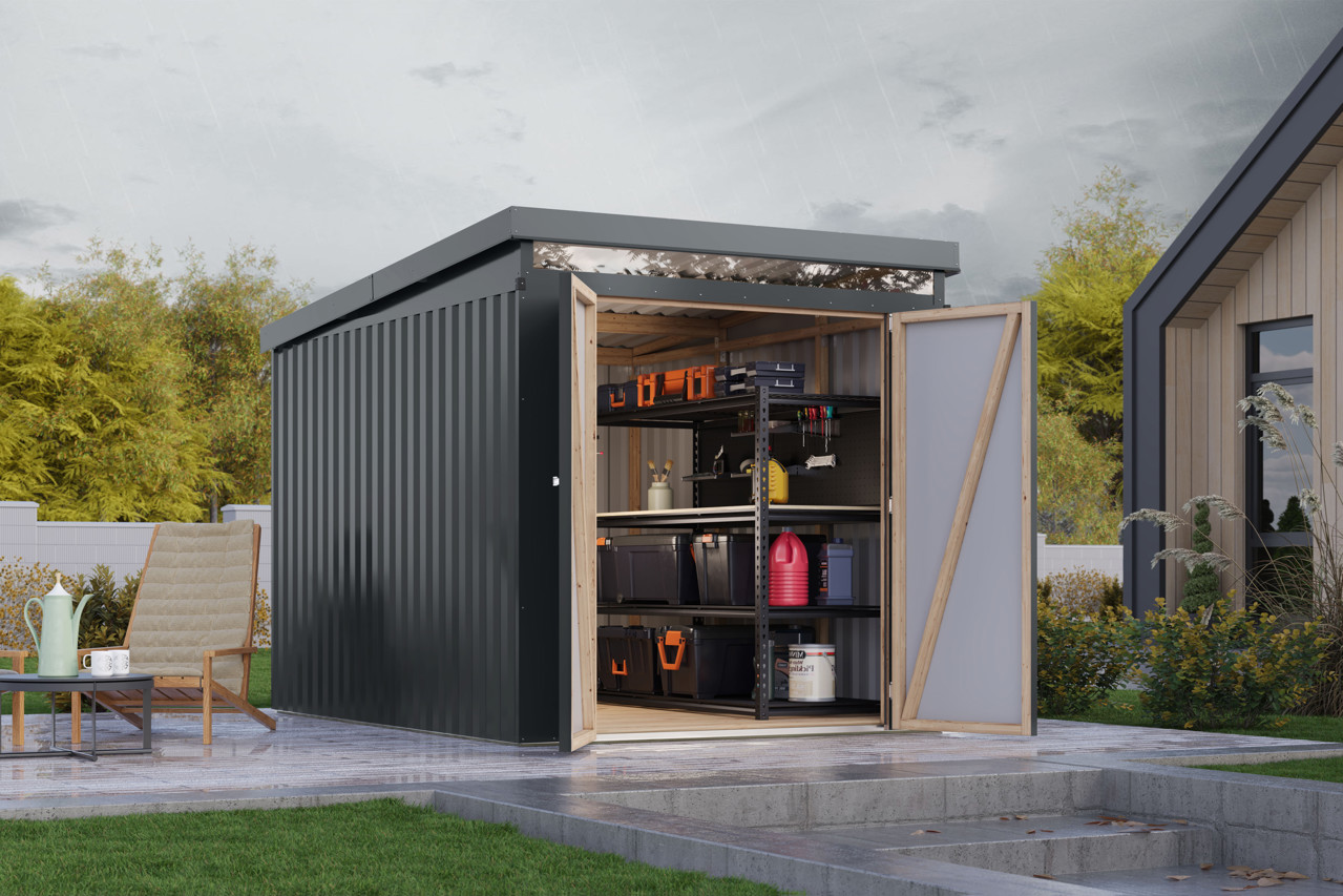 Das Metall Gerätehaus Iridium bietet eine langlebige und praktische Aufbewahrungslösung für Ihren Garten und überzeugt durch Stabilität, modernes Design und eine komfortable Nutzung.