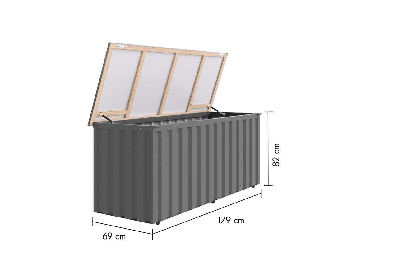 Die stabile Konstruktion aus polyesterbeschichtetem Trapezblech macht die Metallbox besonders robust, langlebig und wetterfest. Dank des praktischen Deckels mit Gasdruckfedern lässt sich die Box komfortabel öffnen und schließen. Der integrierte Grendelriegel-Verschluss sorgt dafür, dass der Deckel sicher geschlossen bleibt.