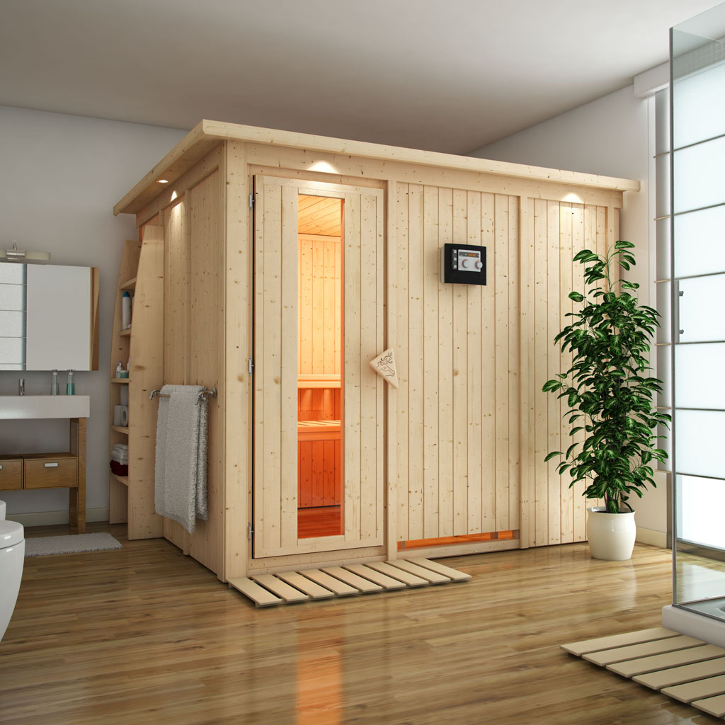 Abbilding zeigt Sauna mit Energiespartür mit bronziertem Isolierglas (ENERGIESPARTÜR)